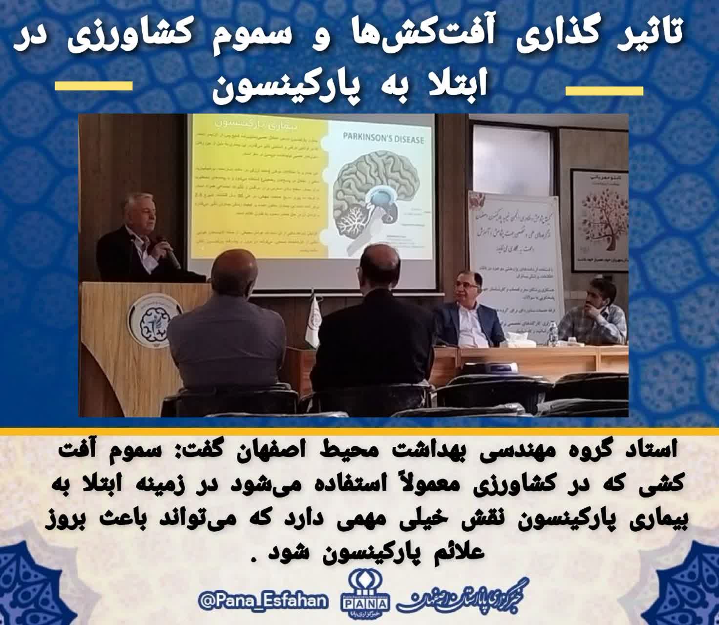 استاد گروه مهندسی بهداشت محیط اصفهان: تاثیر گذاری آفتکشها و سموم کشاورزی در ابتلا به پارکینسون استاد گروه مهندسی بهداشت محیط اصفهان گفت: سموم آفت کشی که در کشاورزی معمولاً استفاده میشود در زمینه ابتلا به بیماری پارکینسون نقش خیلی مهمی دارد که میتواند باعث بروز علائم پارکینسون شود